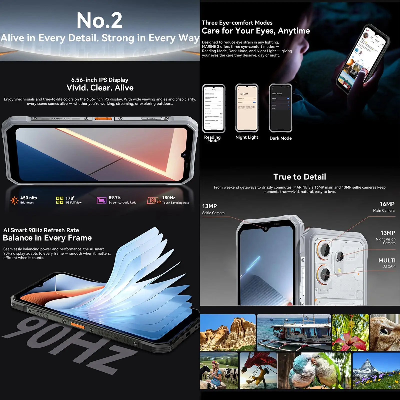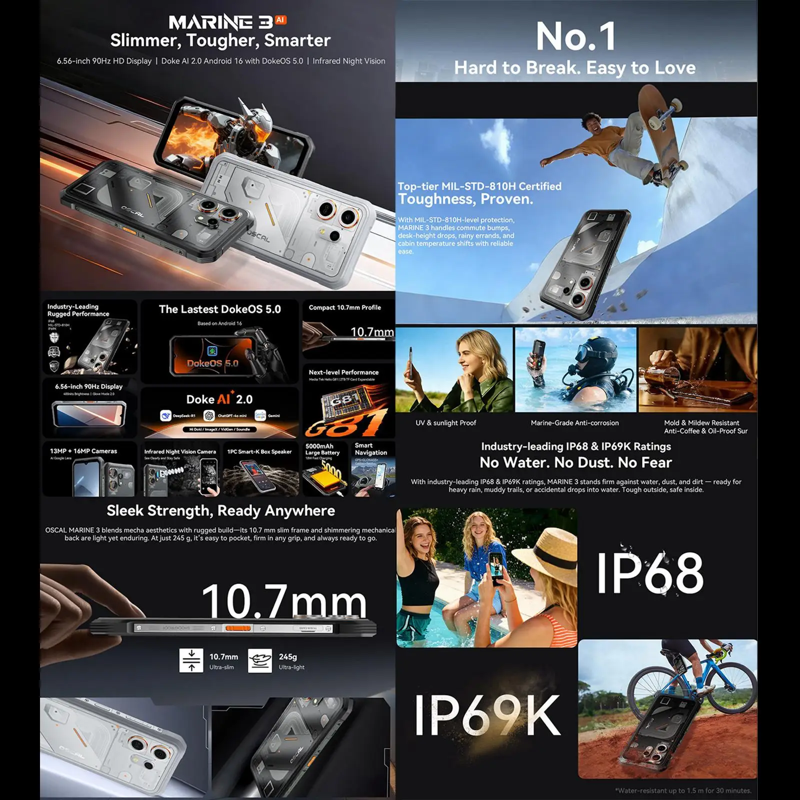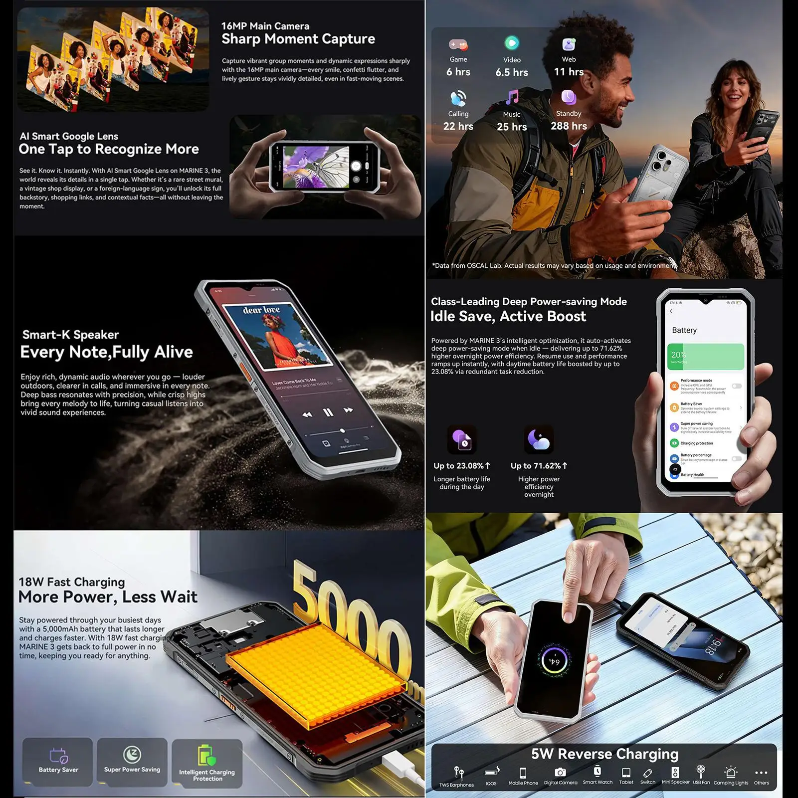 The Oscal MARINE 3 is a modern rugged smartphone designed for everyday reliability and advanced features. Combining a sleek design with night vision capability, expandable performance, and all-day battery life, it's built for users who demand more from their mobile device.